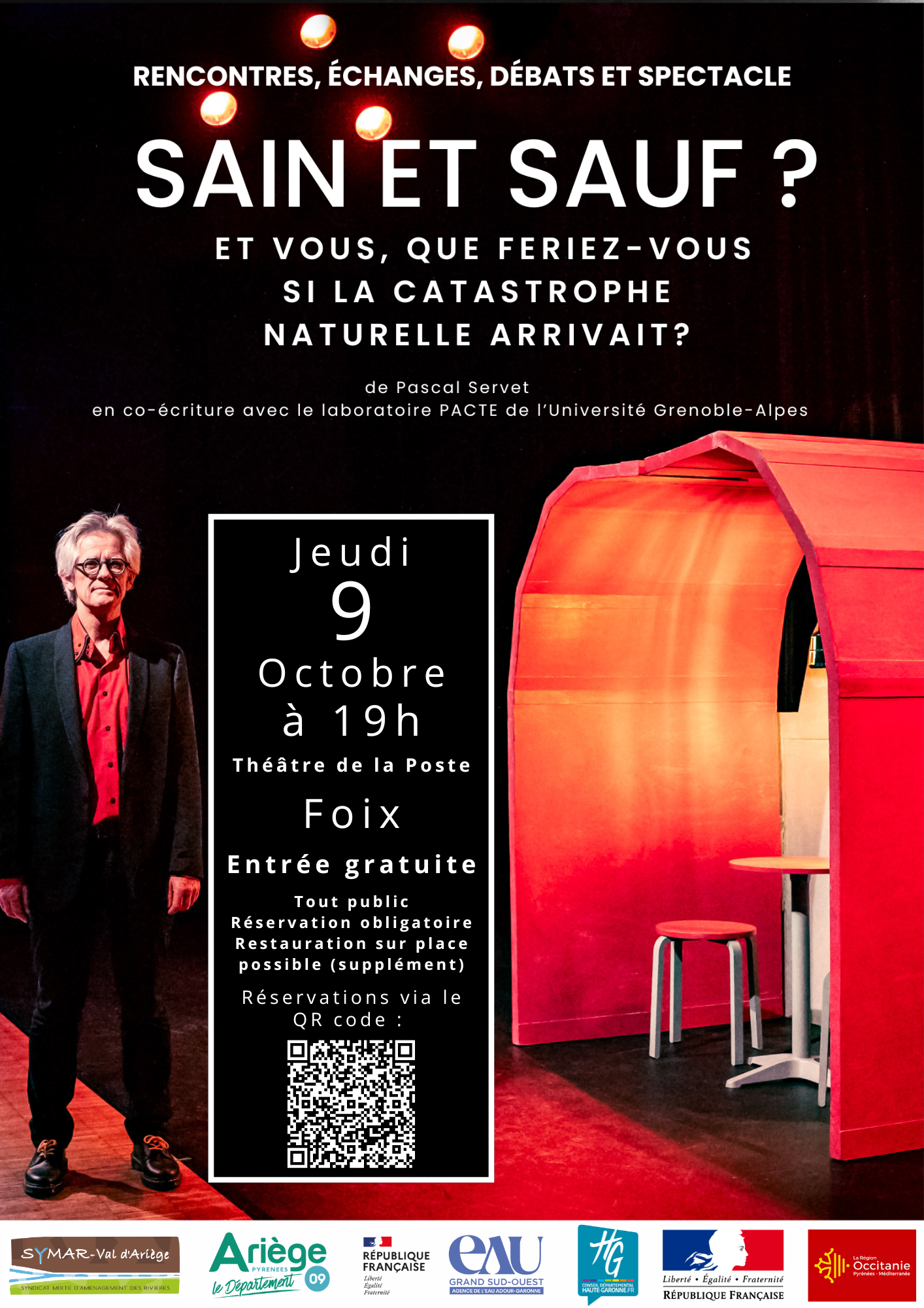 Venez découvrir le spectacle Sain et Sauf de Pascal Servet, une création originale mêlant théâtre immersif et interactif. L’objectif est de faire vivre une scène de catastrophe à un membre du public et de tester ses réactions, devant tous les autres participants afin d'échanger sur les bons gestes à tenir en cas d'inondation. |